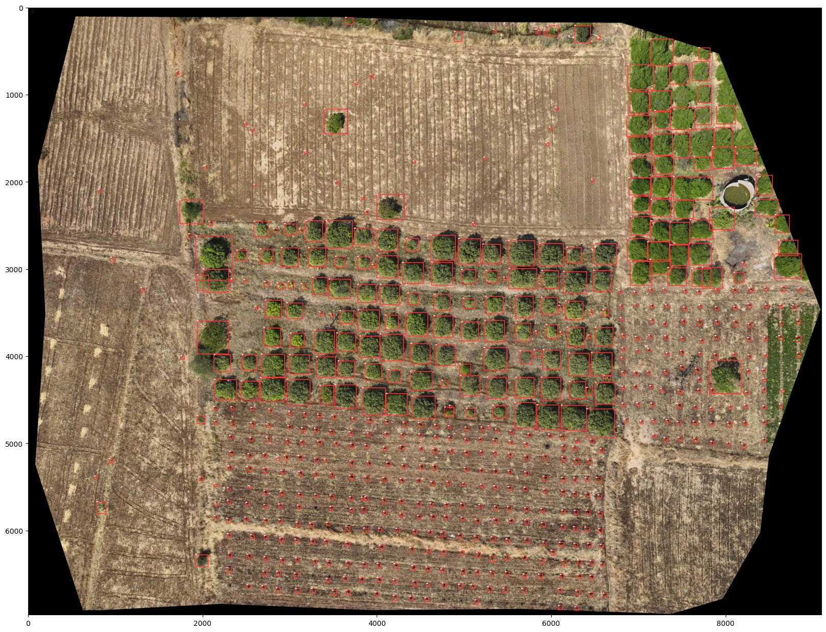 Detectron2 + SAHI used for drip detection had revealed something new: We didnt have to train even the tree detection model on large images. Only small sections of images could be included in the training and inference on sections of the images could be made and results recombined.